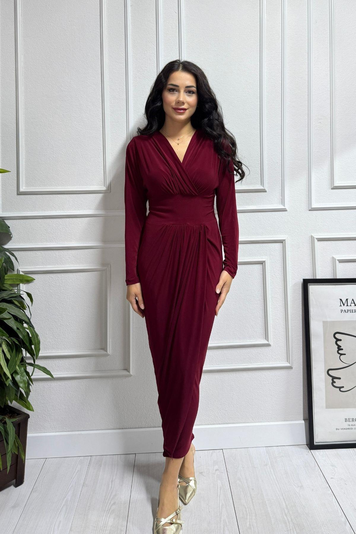 Bordo Beli Kalın Kemer Detay Drapeli Esnek Sandy Elbise. tam kalıp esnektir