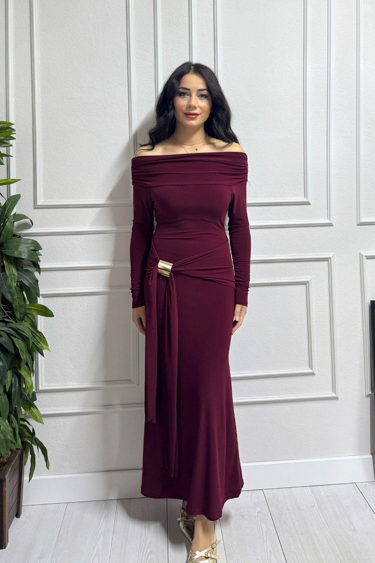 Bordo Beli Toka Detay Madonna Yaka Sandy Elbise. tam kalıp esnektir