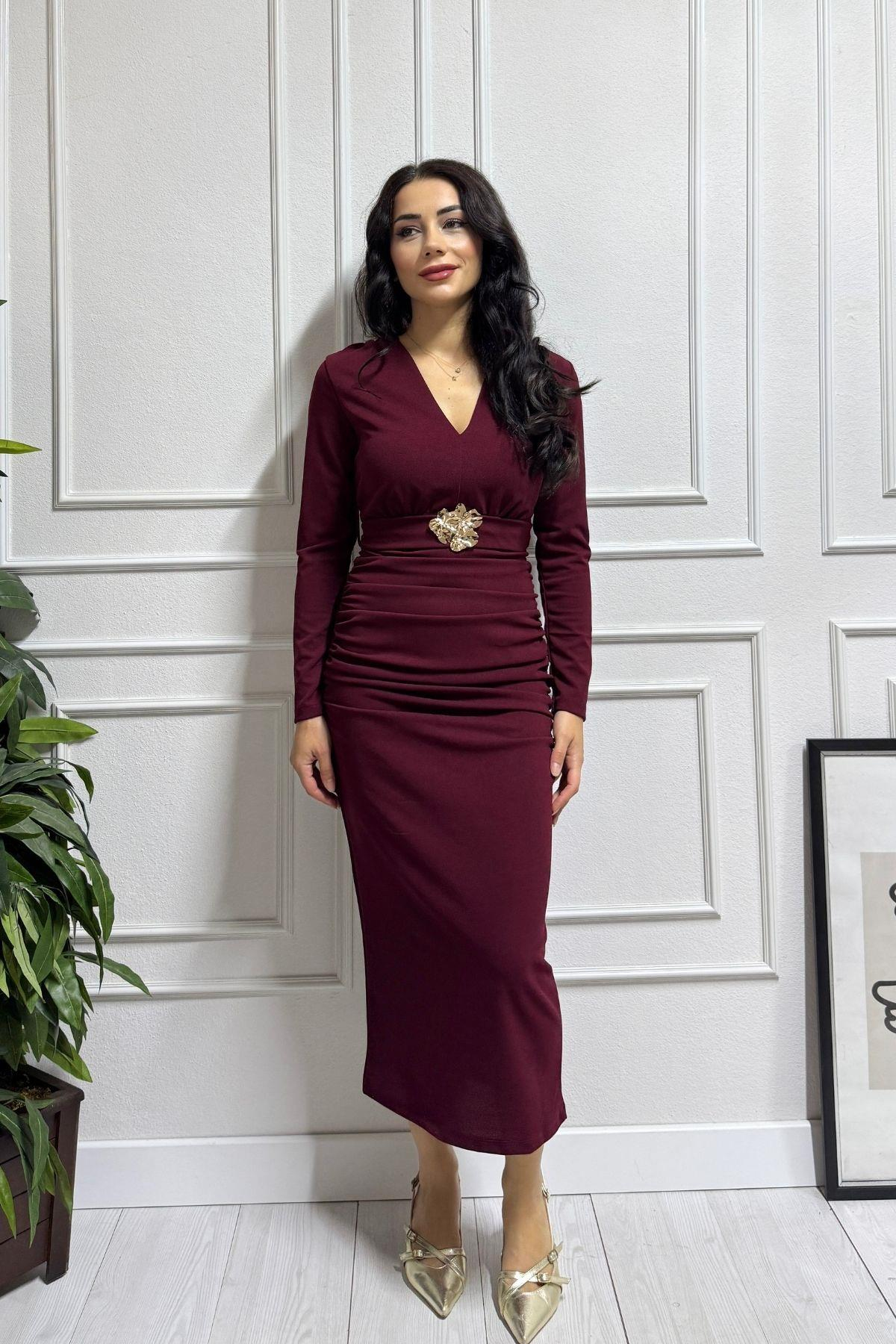 Bordo Kemeri Gold Aksesuar Detay Krep Elbise. tam kalıp esnektir