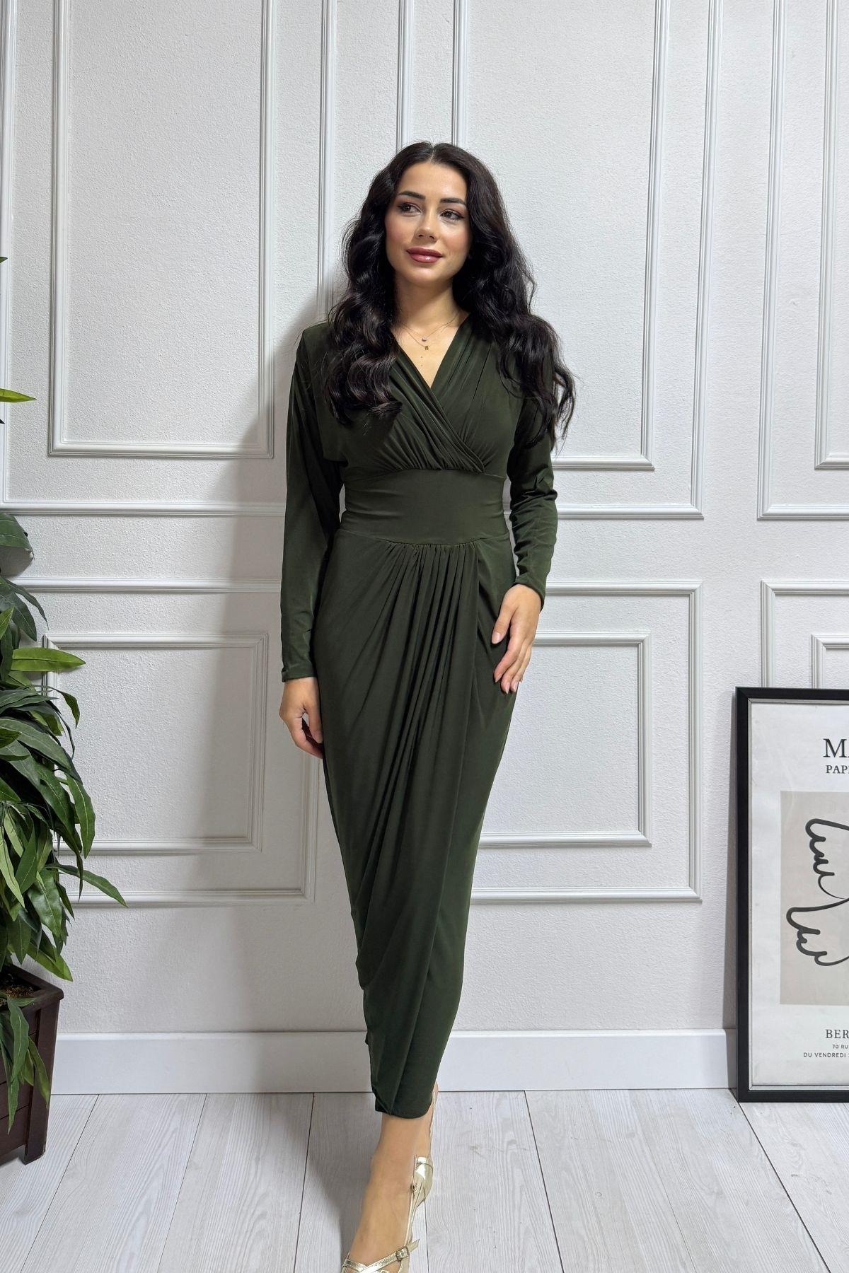 Haki Beli Kalın Kemer Detay Drapeli Esnek Sandy Elbise. tam kalıp esnektir