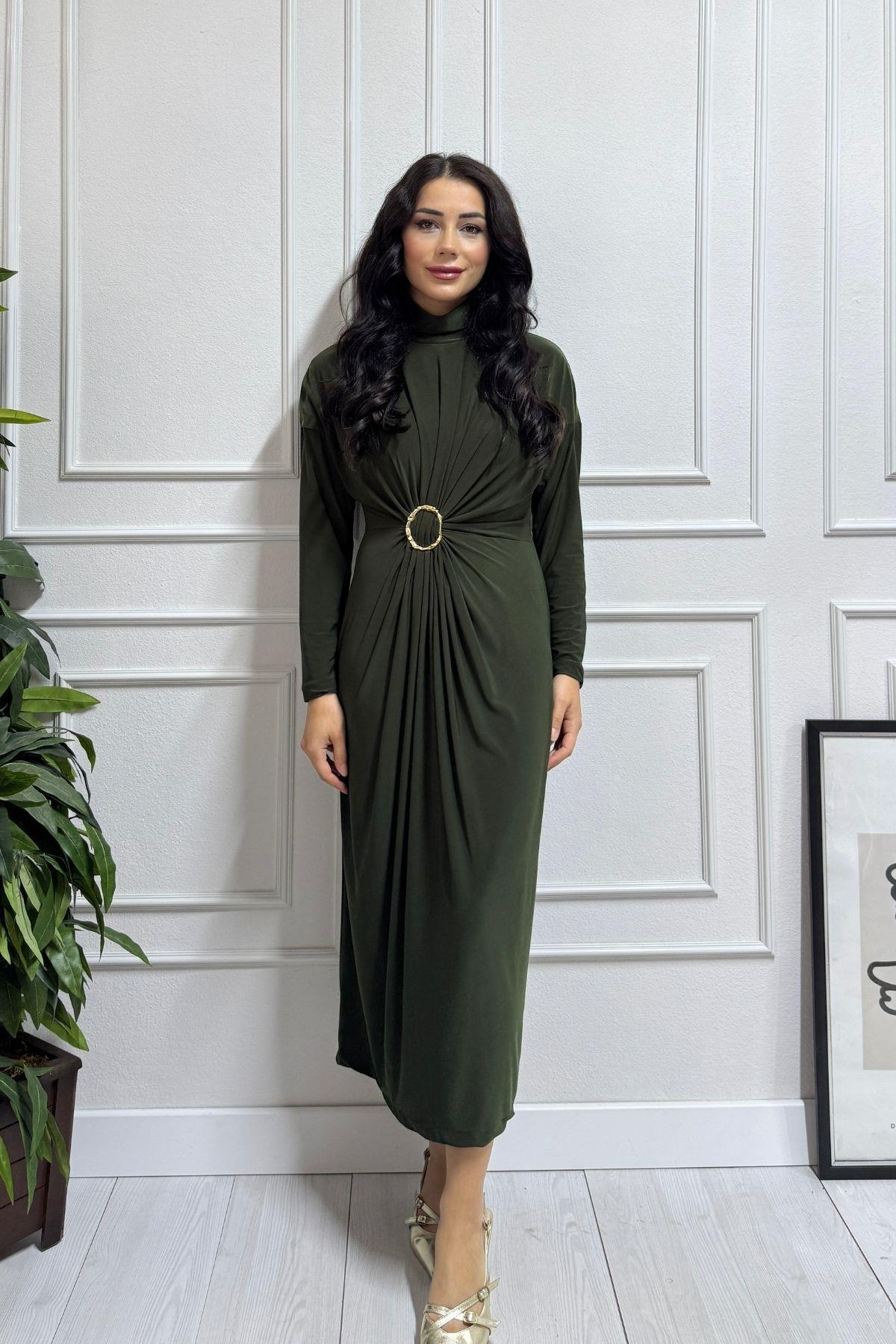 Haki Beli Toka Detay Astarlı Sandy Elbise. tam kalıp esnektir