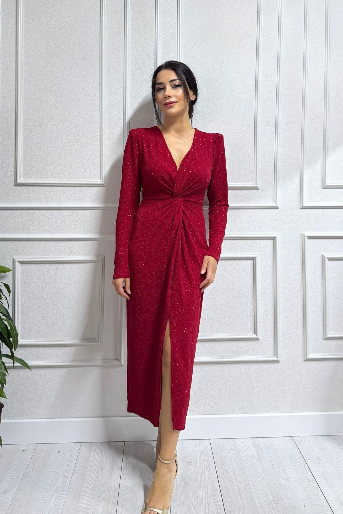 Kırmızı Beli Düğüm Detay Simli Kumaş Elbise. tam kalıp esnektir