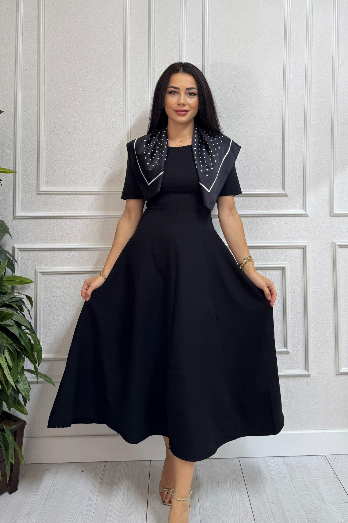 Siyah Fularlı Parçalı Çan Kesimli Elbise. tam kalıp esnektir