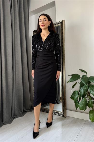 Siyah Üstü Payet Esnek Kalem Elbise. tam kalıp esnektir